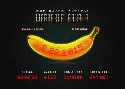 ドールは、東京マラソン協賛8年目を迎える今大会で、世界初の「食べられるウェアラブルデバイス」をテーマに、「ラカタンバナナ」を使った「ウェアラブルバナナ」を開発。走破タイム、心拍数、応援メッセージのほか、東京マラソン2015 コース内4か所(22km/27km/32km/38km)の給食所で、ランナーが最高のタイミングで最高の栄養補給ができるように、最適なバナナ摂取ポイントを表示する。「ウェアラブルバナナ」は完走後に食べることができる。当日は数名の一般ランナーが「ウェアラブルバナナ」を特製リストバンドとして手首に装着し、完走を目指す。