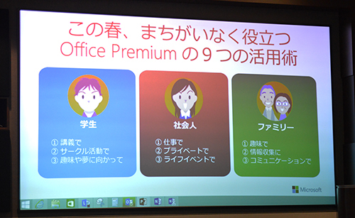 2014年10月に販売を開始したOfficeの新たなライセンスモデル「Office Premium」について、オフィスプレインストール事業統括本部の宗像淳部長は「発売後、さまざまな反響をいただき、手応えを感じている。春商戦では、より具体的な利用シーンを目にみえる形で示すことで、広いターゲット層に訴求を図りたい」と語り、新生活のPC需要を見据えた訴求方法を提示した。