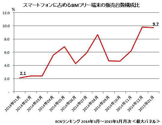 このところ、SIMフリースマートフォンの販売台数は伸び続けている。家電量販店の実売データを集計する「BCNランキング」では、スマートフォンに占めるSIMフリー端末の販売台数構成比は2014年1月の時点で2.1%に過ぎなかったが、この1月には9.7%とほぼ1割の水準まで拡大。5月のSIMロック解除義務化に向けてこの動きはますます加速するものとみられ、MVNO事業者間の競争激化も予想される。