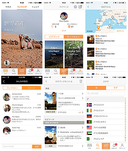 他のユーザーが共有した「ログブック」を目的地やテーマで探すことが可能。気に入ったページはブックマークすることができる。ブックマークした場所は、自分だけのガイドブック「行ってみたいリスト」としてリスト・地図形式でまとめ、自分だけのガイドブックのように使える。