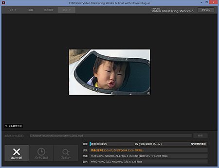 「TMPGEnc Video Mastering Works 5」でのエンコードにかかった時間は約1時間25分だった。これに対して最新版の「TMPGEnc Video Mastering Works 6」では約1時間4分でエンコードが完了した。つまり、同じハードウェアで約20分の時間を短縮できたことになる。エンコード時間は約30%減になったイメージだ。