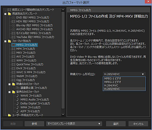H.265/HEVC形式での出力に対応し、H.264/AVCと比べて同じ画質で容量は半分にできる