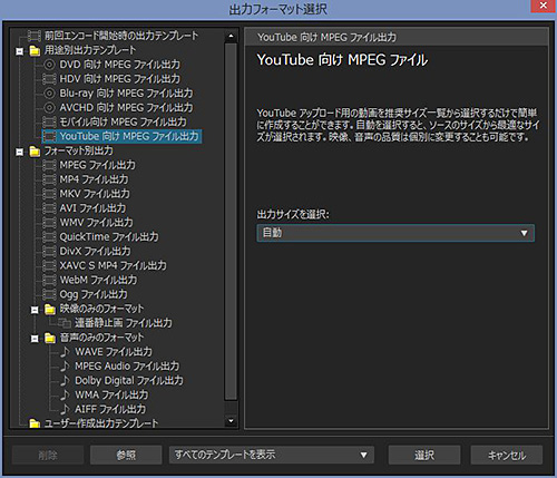 出力テンプレートとしてYouTube向けの設定を用意。出力サイズも選択できる
