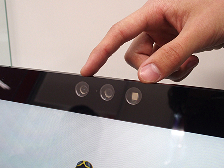 PC上部に設置された3Dカメラユニット。中央が通常の2Dカメラ。右側が赤外線発信部、左側が赤外線受信部。これらの組み合わせで正確な3D画像の取得を実現する