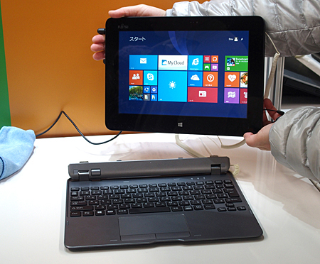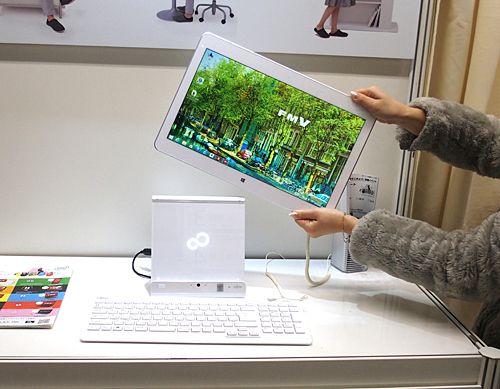 タッチアンドトライコーナーでは、RealSenseテクノロジーの体験コーナーで使われていた、3Dカメラを搭載する23型のデスクトップPC「FMV ESPRIMO WH77/S」のほかに、15.6型の大画面を取り外して使えるデスクトップPC「FMV LIFEBOOK GH77」も人気を集めていた。本体とディスプレイを独自の無線規格で接続することによって、家庭内であれば大画面タブレットのような利用が可能。ディスプレイ部のみの重量は約980gしかないので、さまざまな使い方ができるのが特徴だ。また、タブレットでありながらキーボードと接続することでノートPCとしても使用できる「ARROWS Tab QH55/S」も人目を引いていた。