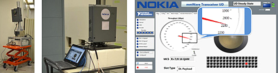 ノキアネットワークスと実施した伝送実験。左から、小型基地局装置、測定装置、計測した通信速度