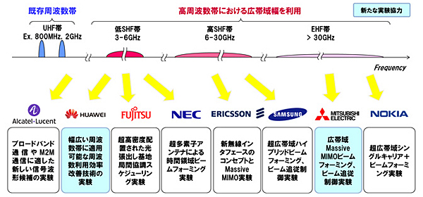 ドコモは、昨年5月にAlcatel-Lucent、エリクソン、富士通、日本電気(NEC)、ノキアネットワークス、Samsung Electronicsの6社と5Gに関する実験協力で合意。さらに、ミリ波帯でのさらなる通信性能の改善や、6GHz未満の周波数帯の活用について検証を進めるために、昨年12月に三菱電機、今年2月にファーウェイとそれぞれ新たな協力について合意した。今後は、計8社と5Gの実験を推進する。