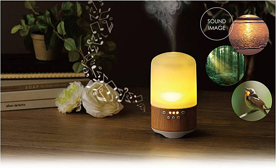 ランタンタイプの超音波式アロマディフューザー「アロマディフューザー トモリ」に、新たにスピーカーを搭載。内蔵する5曲のヒーリングミュージックのなかから気分にあわせてBGMを選んだり、スマートフォンなどの外部オーディオ機器を接続して好きな音楽を流すことができる。