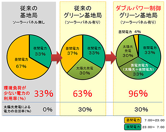 環境負荷が少ない電力の利用率を高めることで、午前7時から午後11時までの昼間電力の利用を従来のグリーン基地局と比較して90%程度抑えることができ、基地局の運用に必要な電力の95%以上を環境負荷が少ない電力で賄うことができる。