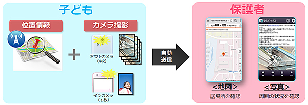 万が一の時の安全性を高めるために、カメラ機能付き防犯ブザーを搭載。ブザーを鳴動させた場合は、位置情報の取得とともに、メイン/サブの両方のカメラで周囲の写真を撮影し、居場所と状況写真を保護者に自動で送信する。