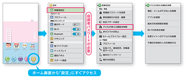 これらの機能は、設定項目をまとめて表示する「保護者設定メニュー」を使って、簡単に設定することが可能。ルールを保護者が強制するのではなく、子どもと保護者が話し合って決めることで、良いこと、悪いことを子どもが判断できるようにサポートする。