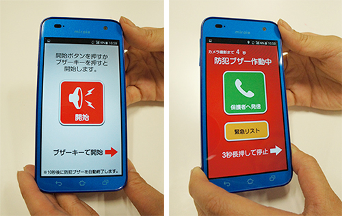 緊急時に防犯ブザーを鳴らすと、居場所と状況写真を保護者に自動で送信