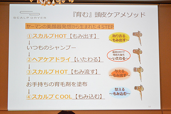 「美容機器メーカーとして常に新しい市場を開拓してきた」と胸を張る山崎貴三代社長。今回着目したのは、発毛や育毛を目的とした「スカルプケア市場」だ。現在「スカルプケア」は、シャンプーや育毛剤、ヘッドスパなどが主流。しかし、あまり重要視されていない「髪を乾かす」という行為に目をつけた。