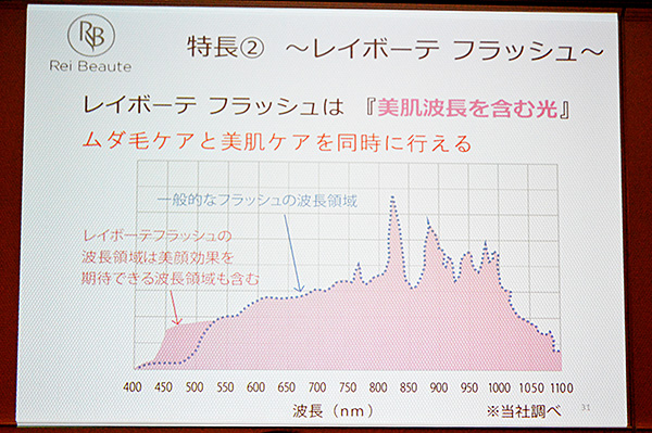 一般的な機器比較して、美顔効果が期待できる短い波長領域を含んでいるため、ムダ毛ケアだけでなく、美肌ケアもできる。日本人の肌色に合わせた波長の光を中心に出力することに加え、照射口をワイドにすることで効率的なムダ毛ケアを実現した。