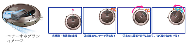 部屋の壁際や隅に綿ゴミが溜まりやすい日本の家屋を考慮して開発した「エアーすみブラシ」を業界で初めて搭載。内蔵する超音波センサで部屋の隅を検知すると、本体側面から風を強く吹き付け、隅のゴミをかきだす。従来機種に比べ、部屋の隅のごみを約2.6倍まで除去する。また、新開発の走行プログラム「縦横無じんシステム」を搭載し、きめ細かく掃除することが可能。新たに搭載したジャイロセンサを使って、規則的な縦・横ジグザグ走行を効率的に行い、家具などが多いと自動で走行パターンをランダム走行に切り替える。