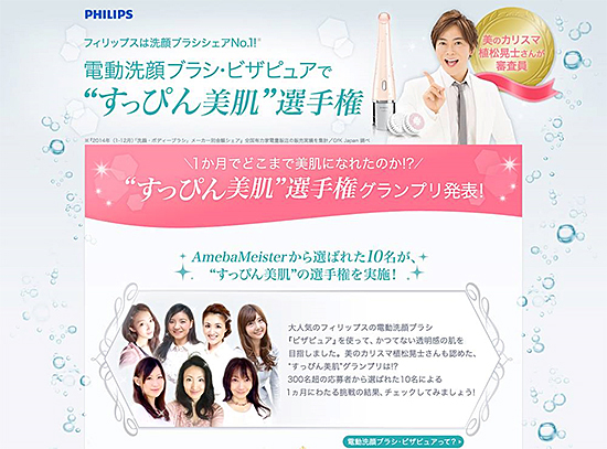サイバーエージェントは3月16日、Ameba女性ブロガー10名がフィリップス エレクトロニクス ジャパンの電動洗顔ブラシ「ビザピュア」を使って美肌を競うコンテスト「すっぴん美肌選手権」の結果を発表した。
