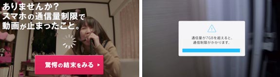 どちらの動画もすんなりと結末を見ることができない仕組み。「【衝撃映像】女子高生『歌ってみた』からの、驚愕の結末!」は、通信量の制限によって動画の視聴中に突然止まってしまう様子を再現し、動画の途中で画面がカクつき、やがて停止する。「【閲覧注意】音信不通の女子大生の自宅を訪ねた結果…」も、動画が最も怖いタイミングで停止し、通信量を超えると通信制限がかかるケースを表現した。