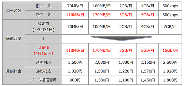 4月1日から提供する新コースの税別月額料金は、「110MB/日」の音声対応が1600円、SMS対応が1020円、データ通信専用が900円。「170MB/日」の音声対応が2080円、SMS対応が1500円、データ通信専用が1380円。「3GB/月」の音声対応が1800円、SMS対応が1220円、データ通信専用が1100円。「5GB/月」の音声対応が2150円、SMS対応が1570円、データ通信専用が1450円。「500kbps(15GB/月)」の音声対応が2500円、SMS対応が1920円、データ通信専用が1800円。
