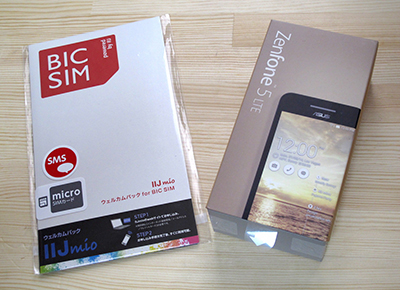 今回は、SIMカードはSMS機能付き「IIJmioウェルカムパック for BIC SIM」、スマートフォンは「ZenFone 5 LTE」を使った