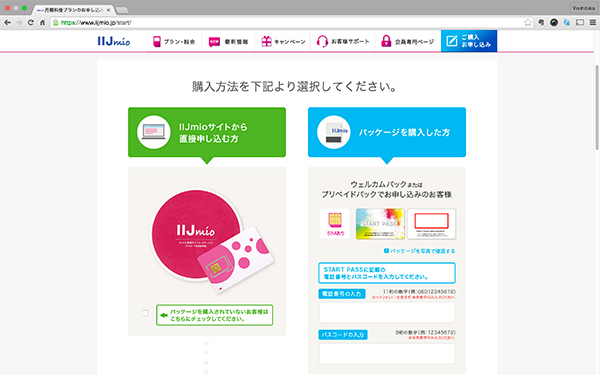 IIJmioのサイトで、購入したSIMカードの利用開始手続きをする。初めて手続きをする際には、クレジット決済も含めたユーザー登録が必要だ。