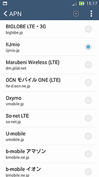 「ZenFone 5 LTE」を起動後、設定→その他→モバイルネットワーク→アクセスポイント名→APN、とたどり、IIJmio 横のチェックを選択してから、ホーム画面に戻る。