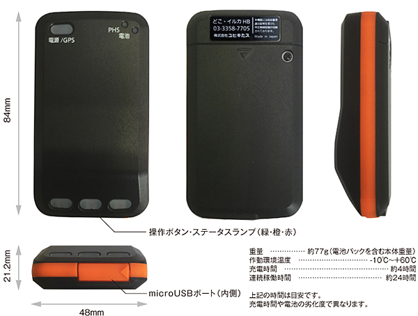 専用端末「どこ・イルカHybrid」のサイズは、幅48×高さ84×厚さ21.2mmで、重さは77g。操作ボタン・ステータスランプ、microUSBポートを備える。連続稼働時間は約24時間。