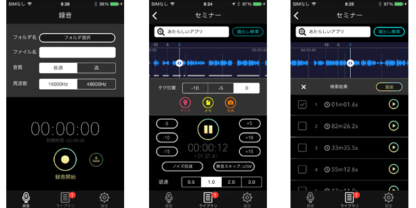 また、音声の無い部分を除いて再生時間を短縮する「無音スキップ」、2倍速や3倍速の早聞きができる「倍速再生」、講義や会議の雑音を和らげて聞きやすくする「ノイズキャンセル」、指定した秒数を飛ばして再生する「指定秒数スキップ」、録音/再生時にマーク・メモ・写真を貼り付ける「タグ付け」、他のアプリで録音したデータを取り込める「インポート」機能を備える。