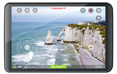 操作性の高さも注目すべきポイントだ。iOS/Android/Windowsのスマートフォンやタブレット端末の無料操縦アプリ「FreeFlight 3.0」は、これまでラジコンを操作したことがないユーザーでも簡単に操ることができる親切な設計。「TAKEOFF」ボタンをタッチするだけで自動で離陸したり、コントロールする端末の傾きに反応して前後左右に動いたり、直感的な操作で思いのままにドローンを動作することができる。GNSS(全地球衛星測位システム)をチップセットし、離陸した場所に自動で帰還する機能も備えるので、ドローンが迷子になってしまう心配はない。