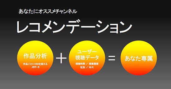 レコメンド機能として導入するのが、新たに追加した「オススメチャンネル」だ。ユーザーの視聴履歴や年齢、性別といった属性情報と各作品のメタデータを元に、ユーザーごとに最適化した作品を自動でリストアップする。