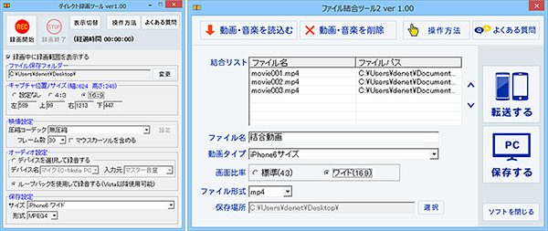 「ダイレクト録画ツール」(左)と「ファイル結合ツール2」