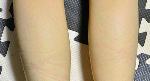 レベル2ではフラッシュの際に温かさを強く感じましたが、全く痛みはありません。「パチン」というフラッシュの音は、夏の大敵であるムダ毛がなくなる祝福の拍手のように感じられます。さらに2週間後、ケアの効果を確認してみました。すると、「レイボーテ スピーディ」で処理した方の毛が、明らかに目立たなくなってきています。このまま続けていけば、夏までにはツルツルのお肌を手に入れられそうです。