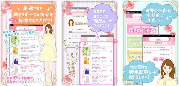 アプリを起動し、初回の簡易アンケートで肌質、年齢などを入力すると、アンケートの結果に基づいたおすすめ商品を表示。自分に合ったスキンケア化粧品選びをサポートする。価格、新着、人気などの順に並び替え、商品のお気に入り登録も可能。キャンペーンで使える割引きクーポン、特集ページなども用意。気に入った商品があればアプリ内で申し込みや購入ができる。