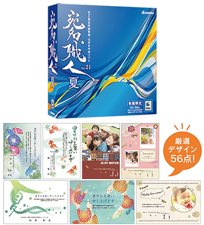 「宛名職人」は、Macでの住所録管理や宛名印刷、挨拶状を中心としたペーパーアイテム作りができるソフト。Windowsの住所録やMacの連絡先アプリをはじめとしたさまざまなデータの読み込みに対応し、手もちの住所録を使ってすぐに宛名印刷ができる。今回発売する「宛名職人Ver.21 夏」は、宛名職人シリーズの最新版「宛名職人Ver.21」に、暑中見舞いをはじめとした今年の夏限定の挨拶状デザイン56点を付加する。