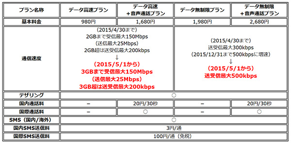 「データ無制限プラン」は、通常は、送受信最大300kbpsで、12月31までのキャンペーンの実施にともない、現在は500kbpsに増速している。5月1日からは、これを正式なサービスとして提供。1980円の「データ無制限プラン」、2680円の「データ無制限+音声通話プラン」ともに、5月1日から送受信最大500kbpsになる。