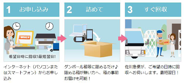 インターネットで申し込み、不用になったPCをダンボール箱に詰め、希望の日時に佐川急便が回収する。PC本体を含む回収1回につき1箱が無料。箱に入れば、PCと一緒に小型家電も無料で回収する。PCのデータ消去ソフトも無料で提供する。オプションで、消去証明書つきのデータ消去サービス「PCデータ消去おまかせサービス」も1台税別1600円で利用できる。なお、PCを回収しない場合は、通常通り1箱あたり税別880円になる。