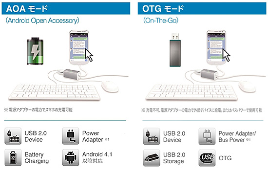 充電しながらキーボドやマウスが使用できるAOAモード(左)と、USBデータのやり取りが相互にできるOTGモードを搭載