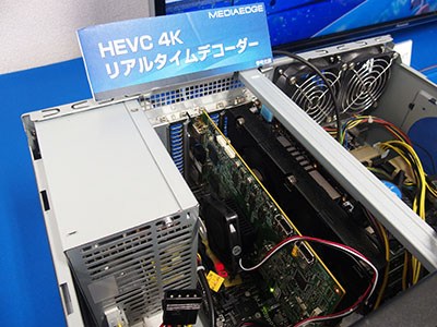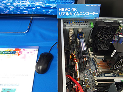 4K/60pのHEVCリアルタイムエンコーダボード「ME-ENC5000SDI4」と、同デコーダボード「ME-DEC5000HDMI」のデモンストレーションの模様