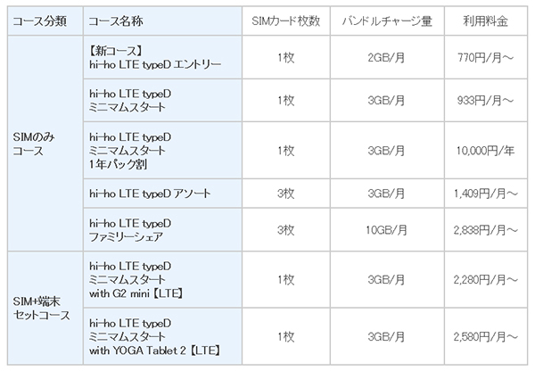 「hi-ho LTE typeDシリーズ」の既存のコースは、SIMだけの場合、バンドルチャージ量が月間3GBまたは10GBの4コースで、月間2GBの新コースを追加することで、5コースになる。SIM+端末のセットは、バンドルチャージ量が月間3GBの2コースがある。