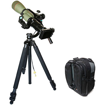 コンパクトデジタルカメラ「エクシリム EX-100」と、興和光学のスポッティングスコープ「TSN-884」、または「TSN-774」、接眼レンズ、アダプターコンバーターリング、照準器ステー、照準器、ケーブルレリーズ、レリーズステー、カメラマウント、ロングプレート、雲台、三脚、リュックをセットにした。