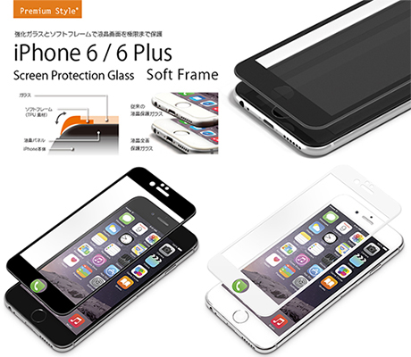 「iPhone 6/6 Plus用液晶全面保護ガラス ソフトフレーム」。液晶画面の曲面部分にフィットする