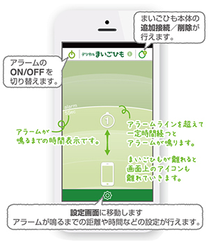 Bluetooth 4.0に対応し、本体を持った対象(子ども)がスマートフォンから設定範囲よりも離れて、一定時間が経過するとアラームが鳴って知らせてくれる。設定範囲は4段階で設定することができ、約8m~30mの範囲で検知できる。