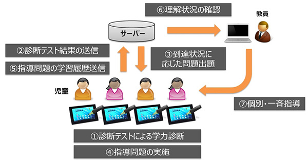 児童が各自のタブレット端末で学習を進め、教員は日々の学習履歴から児童全員の課題や理解状況を把握することができるシステム。ペン入力が可能なタブレット型などの児童用Windows端末、アプリケーション実行用サーバーとPCなどの教員用の機器、小学3~6年生の国語と算数を対象としたデジタル教材(診断テスト、指導問題)、Windowsタブレット対応対応の児童用アプリケーション、教員用のサーバーアプリケーションで構成する。