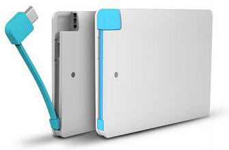 本体は薄型・軽量で、カードサイズと小型なので、手軽に持ち運べる。また、充電ケーブルが本体と一体になっているので、別途ケーブルを持ち歩く必要がなく、ケーブルの紛失も防げる。バッテリ容量は2500mAh。