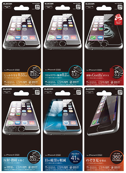 ラインアップは、「スタンダードタイプ」、厚さ0.2mmと0.15mmの2種類から選べる「薄型タイプ」、iPhone 6の液晶画面と同じ、Gorillaガラスを採用した「Gorillaガラスタイプ」、光の映り込みを防ぎ、反射防止加工を施した「マットタイプ」、ブルーライトを約41%カットする「ブルーライトカットタイプ」、特殊加工で視界を制限する「のぞき見防止タイプ」の計7種。