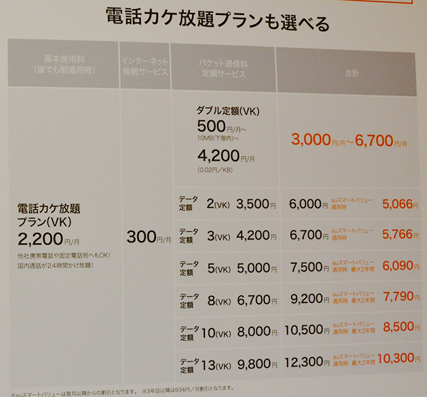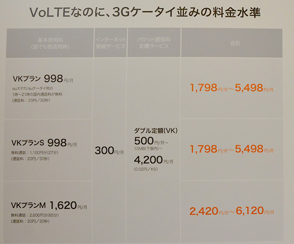 「VKプラン」は、au携帯電話宛ての1~21時の国内通話料が無料となる「VKプラン」、月1100円分(27分)の無料通話付きの「VKプランS」、月2600円分(65分)の無料通話付きの「VKプランM」を用意。データ定額サービスは「ダブル定額(VK)」となり、定額料500円からデータ通信量に応じた料金(上限額4200円)で利用できる。そのため、最低月額1798円から利用できる。