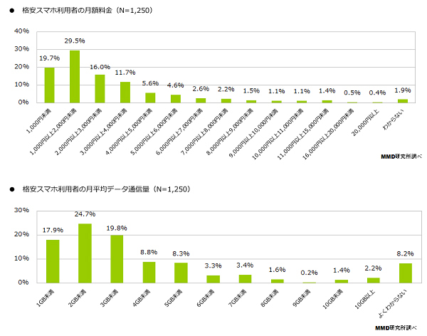 格安スマホの月額料金(上)と月平均データ通信量(N=1250)