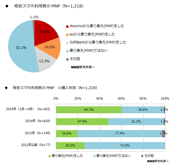 携帯電話会社から格安スマホ利用者に乗り換えた割合(上)と、購入年別のMNPの割合(N=1218)