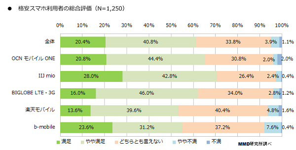 格安スマホの満足度。「満足」と「やや満足」を合算した割合は、IIJ mio利用者が最も高かった