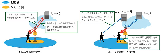 これまで60GHz帯の電波は、1Gbps以上の広帯域伝送路を提供できる一方、遠くまで電波が届きにくいことから、移動通信サービスでの利用は難しいとされてきた。また、現在のLTEの数百Mbpsレベルの速度から数Gbpsとなるため、固定網の回線速度が問題になることも想定される。これに対して、今回、60GHz帯通信とLTEを協調させる通信方式を開発。ユーザーが今後必要とするコンテンツを先回りさせるシステムと、新しいネットワークアーキテクチャ技術として研究が進められているCCN(Content Centric Networking)技術を使用した。