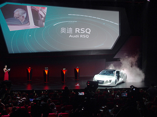 アウディAGのUlrich Hackenberg技術開発取締役が、映画、アイ,ロボットに登場する自動運転のコンセプトカー「RSQ」に乗って颯爽と登場。「アイ,ロボットでは、主人公が自分で運転をしようとすると、危険だからと手動で運転するのを車に遮られる場面がある。安全のために自動運転にする時代はもう目前だ」として、「SFの世界が現実のものになる」と断言した。